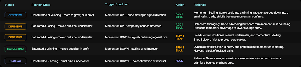 Example B: The Defended Loser—The AI enters a long position. The market immediately pulls back. Believing in the signal, the algorithm averages down (but only on green momentum candles), slowly building to 10-block capacity. Then a negative catalyst hits. The position is maxed, underwater, and momentum turns deeply negative. Trim Lock engages instantly. Blocks are shed one-by-one on every downward tick. Instead of absorbing a full 10-block stop-out, the fund takes a highly mitigated, controlled loss that protects the overall equity curve.