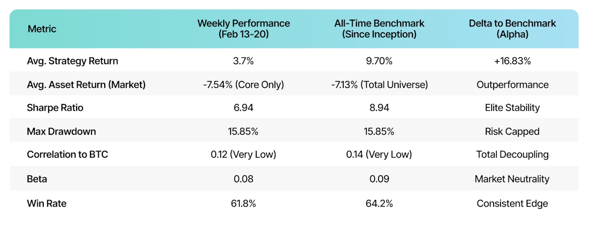 While the weekly return stood at 3.7%, the defining metric was the portfolio's exceptional Sharpe Ratio of 6.94. This high risk-adjusted return underscores the Seneca Engine’s ability to extract consistent alpha while effectively neutralizing the idiosyncratic volatility typically found in unmanaged crypto holdings.